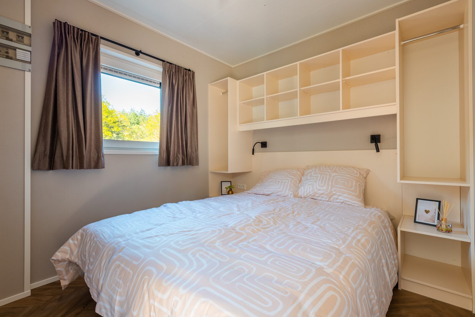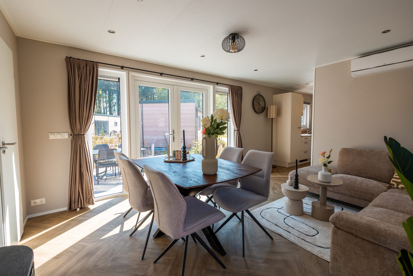 Of je nu de dag begint met een ontbijtje in de ochtendzon of afsluit met een goed glas wijn op het terras — in de Groeneborg lodge voelt elk moment bijzonder. Binnen geniet je van moderne voorzieningen zoals airconditioning, gratis wifi en een stijlvolle inrichting met oog voor detail. De open keuken nodigt uit tot samen koken, terwijl de zithoek de perfecte plek is voor spelletjes, gesprekken of gewoon even niets doen. Hier draait het om comfort, warmte en quality time met elkaar.